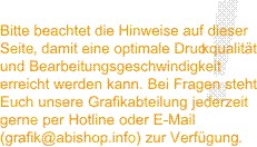 Wenn Ihr von alldem jetzt nur „Bahnhof“ versteht, dann lasst Euch nicht abschrecken und schickt uns Euer Motiv einfach so, wie Ihr es habt. Unsere Grafiker erledigen dan den Rest.